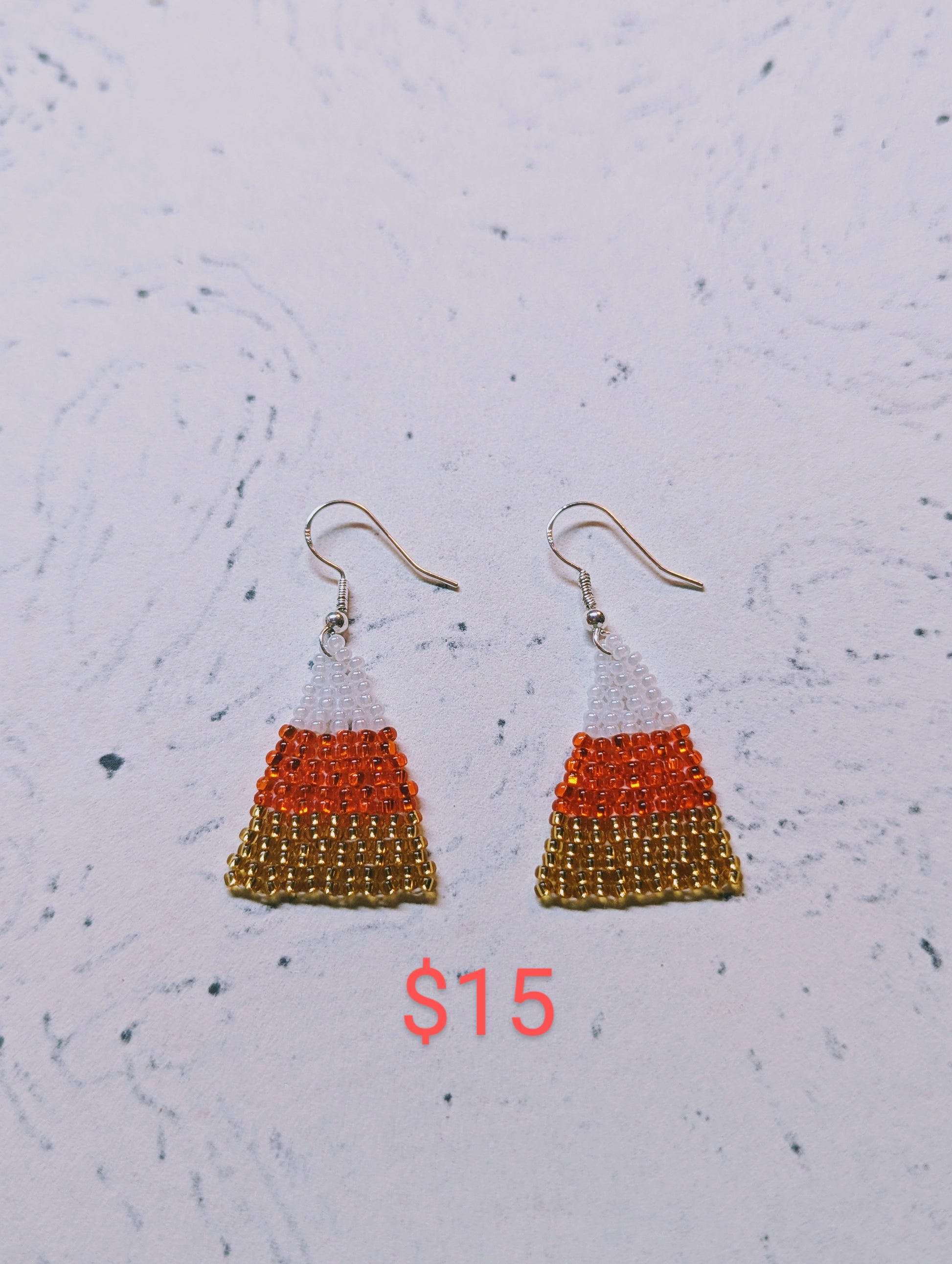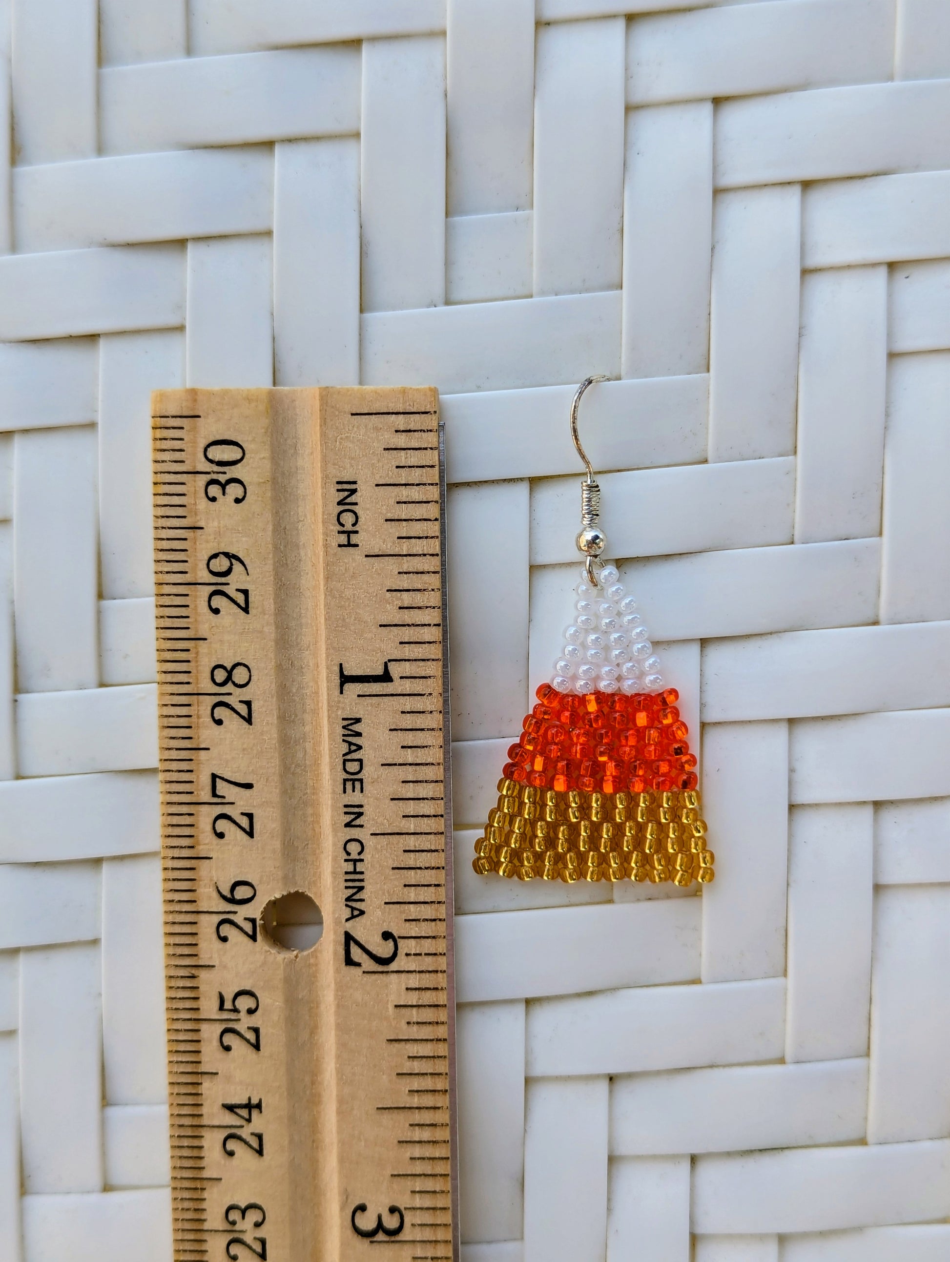 Hand sown, beaded candy corn earrings! A sweet treat for your ears. Earrings are made with glass seed beads, nylon thread, and a fishhook style earring hook.